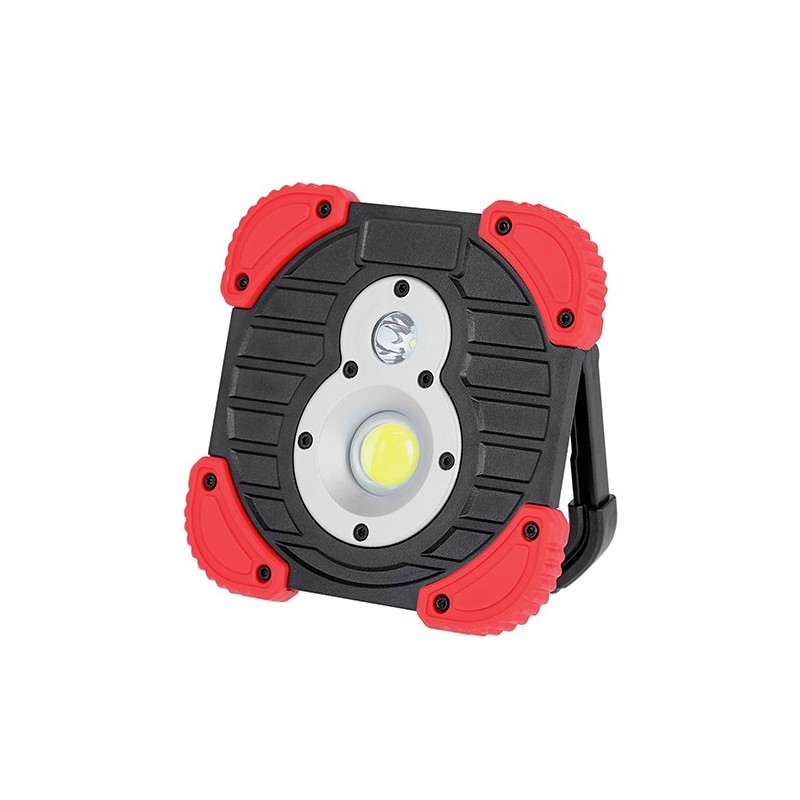 Con pie de apoyo reclinable. Luces regulables por interruptor. Esquinas engomadas. Batería recargable con función Power Bank. IP65. Tapa trasera estanca con cable y conexión USB y microUSB. Indicador LED de carga. 1.000 Lm. 10 W.