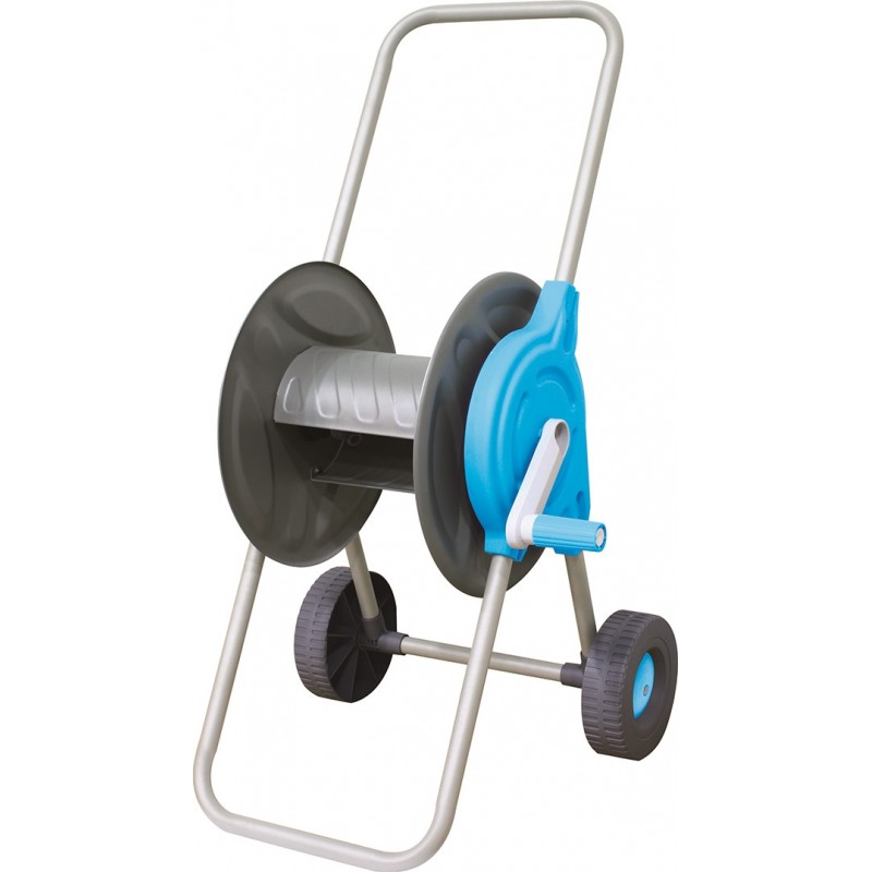 Estructura metálica. Máx. 60 m. 13 mm 1/2” Asa de transporte y manivela. Ruedas amplias de giro suave, que facilitan mover el carro incluso con gravilla, tienen perfil especial para proteger el césped.