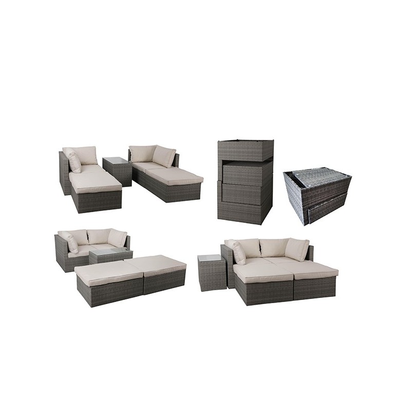 Crea tu propio diseño, múltiples posiciones. 2 sofás en esquina, 2 reposapiés y mesa de ratán gris. Incluye cojines.