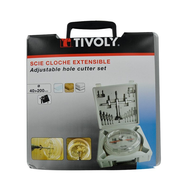 1 guía extensible Ø40>200 mm 2 hojas HCS. 2 Hojas de Carburo. 2 brocas Centradoras. 5 brocas Madera. 5 Brocas Hormigón. 1 Llave Allen.